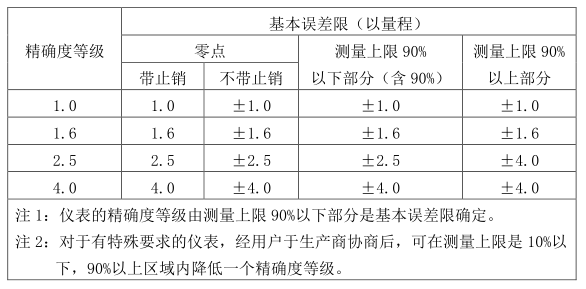 根據(jù)******標(biāo)準(zhǔn)《一般壓力表》(GB/T 1226-2010),普通壓力表的精度分為1.0級(jí)、1.6級(jí)、2.5級(jí)和4.0級(jí);根據(jù)******標(biāo)準(zhǔn)《精密壓力表》(GB/T 1227-2010,精密壓力表的精度分為0.1級(jí)、0.16級(jí)、0.25級(jí)和0.4級(jí)。