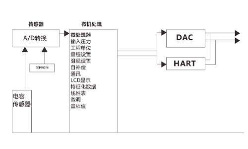測量壓力由電容式敏感元件轉(zhuǎn)換為電容變量,經(jīng)C/D電路直接轉(zhuǎn)換為數(shù)字信號轉(zhuǎn)換后送往微處理器,通過運(yùn)算修正的數(shù)字信號再經(jīng)D/A轉(zhuǎn)換成4~20mADC輸出信號送往顯示/調(diào)節(jié)儀表或DCS等裝置。通信線路將來自微處理器的測量壓力數(shù)字信號轉(zhuǎn)換成頻率信號并疊加于4~20mADC模擬信號上,由相應(yīng)的HART終端設(shè)備接收。